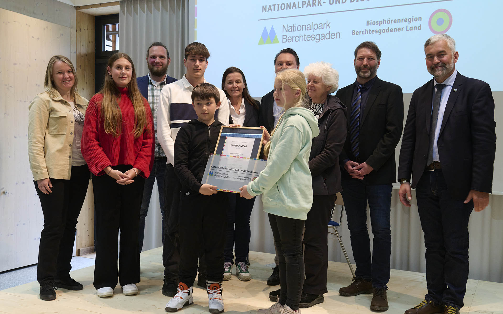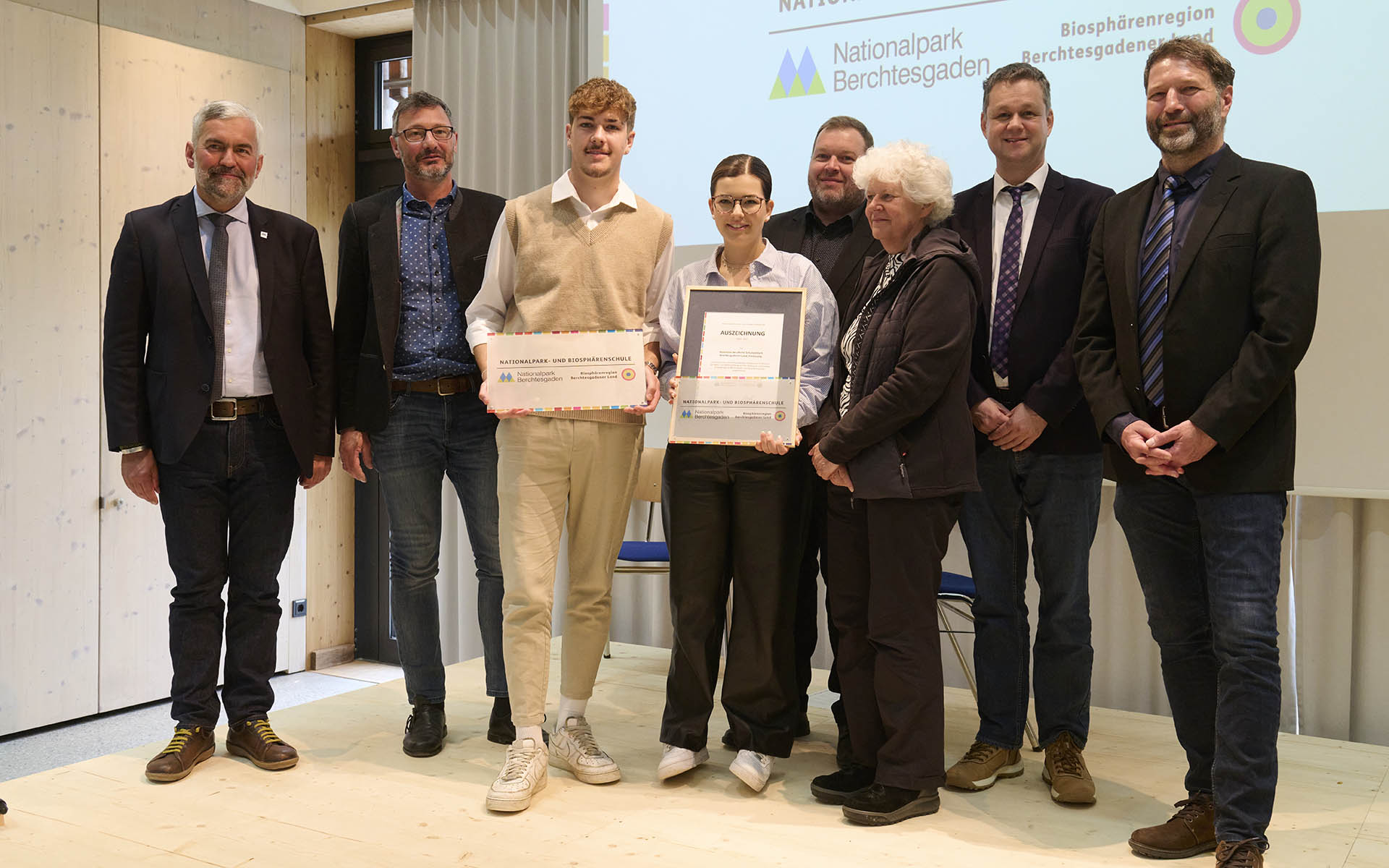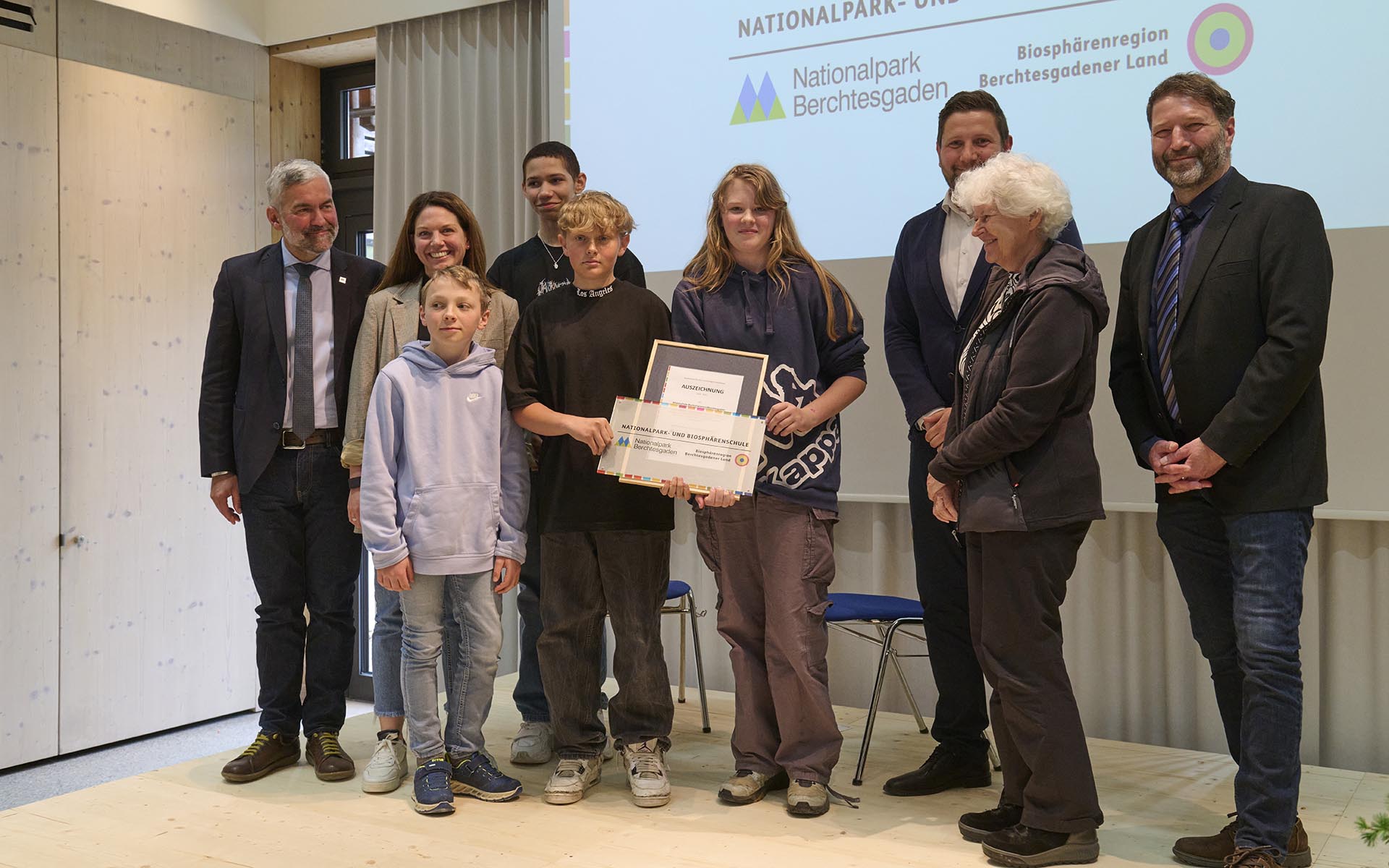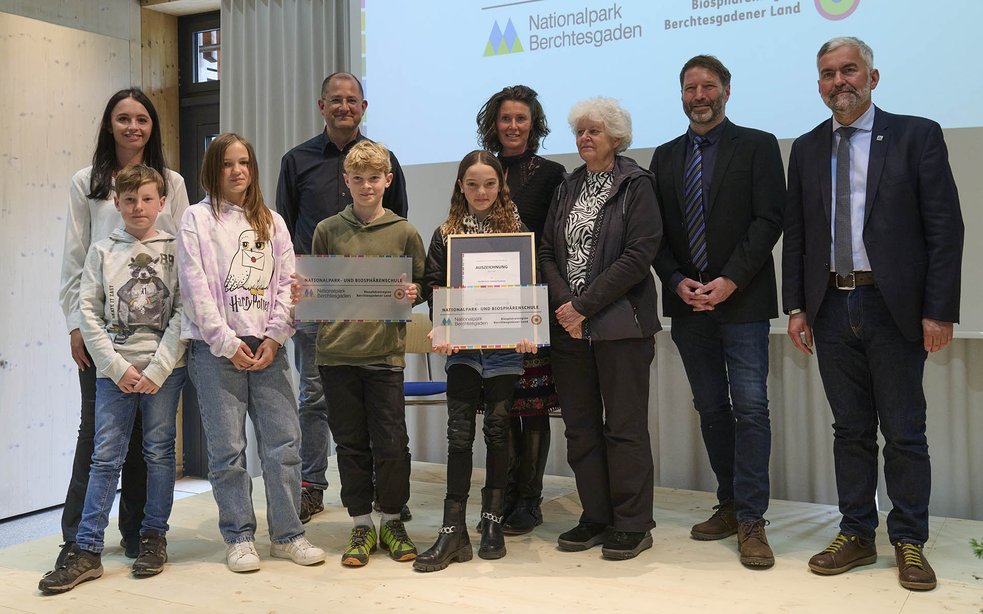 Nach der zweijährigen Pilotphase konnten im April 2024 alle acht Pilotschulen offiziell als „Nationalpark- und Biosphärenschule“ ausgezeichnet werden. Bei der feierlichen Zertifizierungsfeier im Haus der Berge in Berchtesgaden präsentierten Schülerinnen und Schüler Highlights aus der Pilotphase und berichteten, wie sie sich für die Natur und Nachhaltigkeit engagieren.