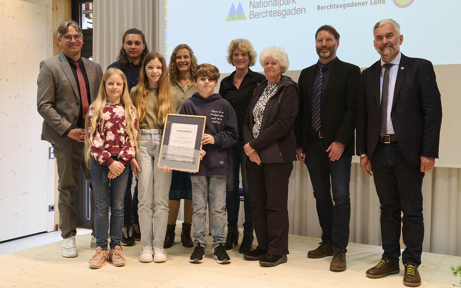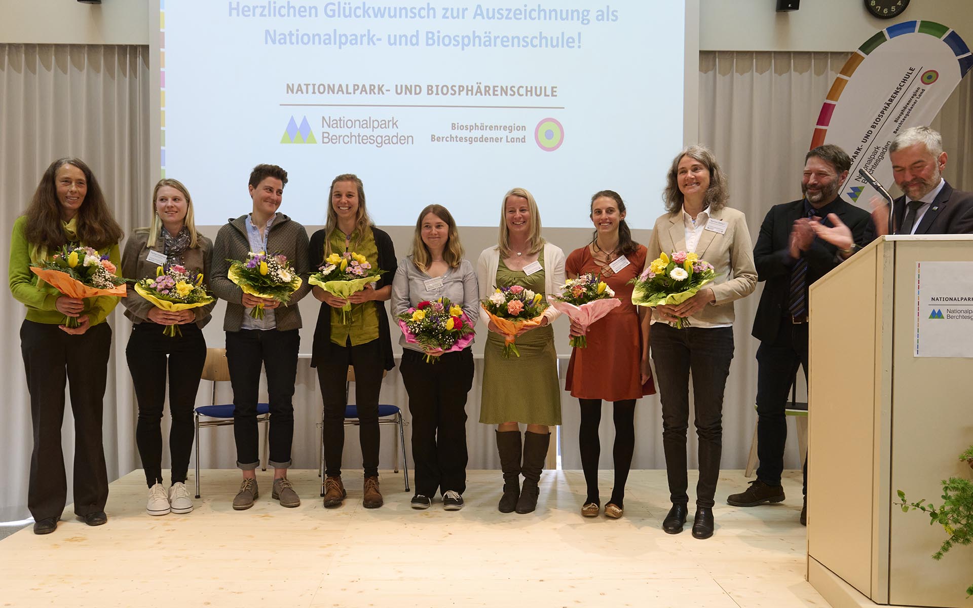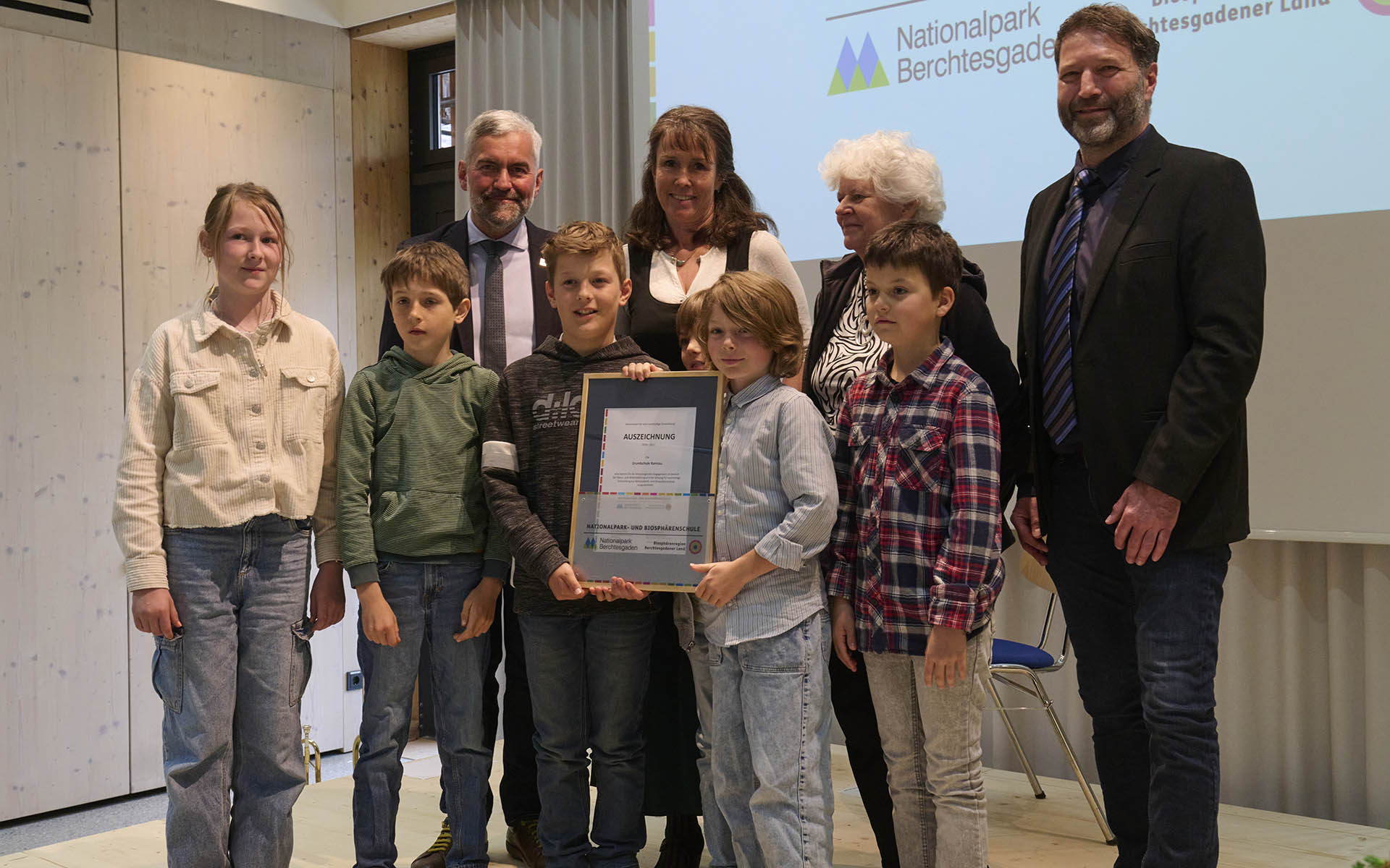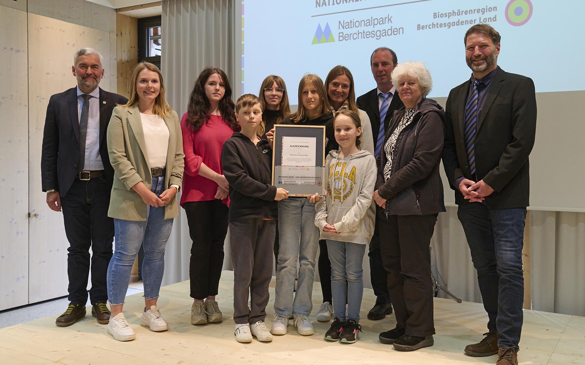 Nach der zweijährigen Pilotphase konnten im April 2024 alle acht Pilotschulen offiziell als „Nationalpark- und Biosphärenschule“ ausgezeichnet werden. Bei der feierlichen Zertifizierungsfeier im Haus der Berge in Berchtesgaden präsentierten Schülerinnen und Schüler Highlights aus der Pilotphase und berichteten, wie sie sich für die Natur und Nachhaltigkeit engagieren.