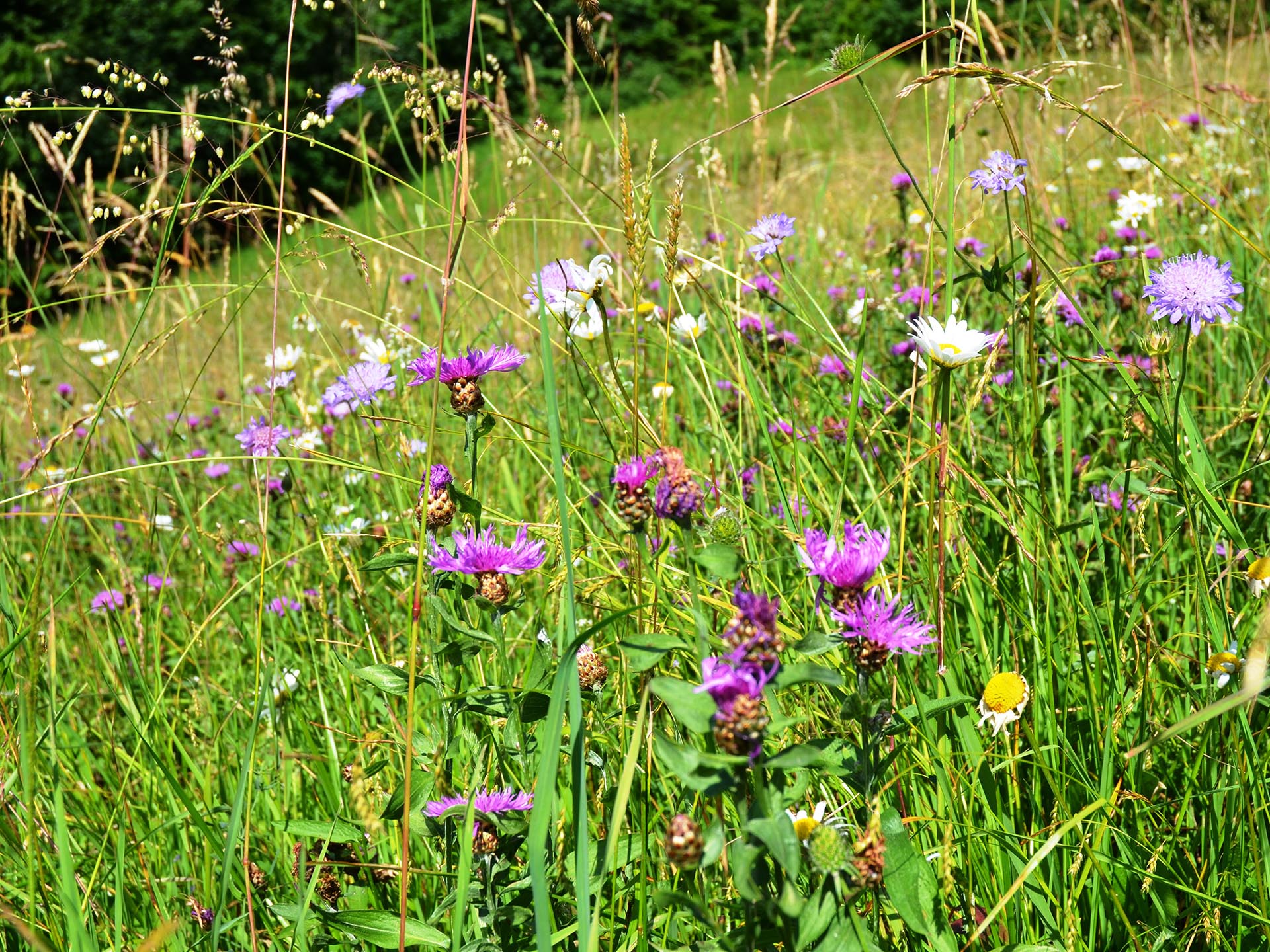 Artenreiche Flachland- oder Bergmähwiesen zeichnen sich durch eine große Vielfalt an Pflanzen- und Tierarten aus. Mit meist nur 1-2 Schnitten pro Jahr und wenig Düngung haben die Gräser und Kräuter dieser Mähwiesen Zeit zu wachsen, zu blühen und ihre Samen auszubilden. Damit erneuert sich der Bestand der Wiese jährlich immer wieder neu. Als traditionelle, bunte Bauernwiese, mit z.B. Margeriten, Wiesenbocksbart, Glockenblumen oder Wiesenwitwenblumen, ist sie vielen von uns in Erinnerung. 80-150 verschiedene Pflanzenarten kann man auf einer solchen Wiese finden.
