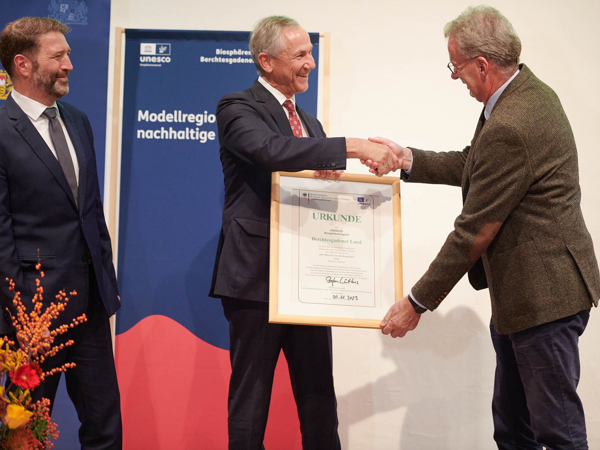 10 weitere Jahre darf das Berchtesgadener Land nun nach erneut erfolgreich bestandener UNESCO-Evaluierung die Auszeichnung Biosphärenregion führen. Der Amtschef des bayerischen Umweltministeriums, Dr. Christian Barth, und der Leiter der Biosphären-Verwaltung, Dr. Peter Loreth, erhielten auf dem gemeinsam ausgerichteten Festakt am 20. November 2023 vom Vorsitzenden des MAB-Nationalkomitees, Dr. Stefan Lütkes, die entsprechende Urkunde überreicht.